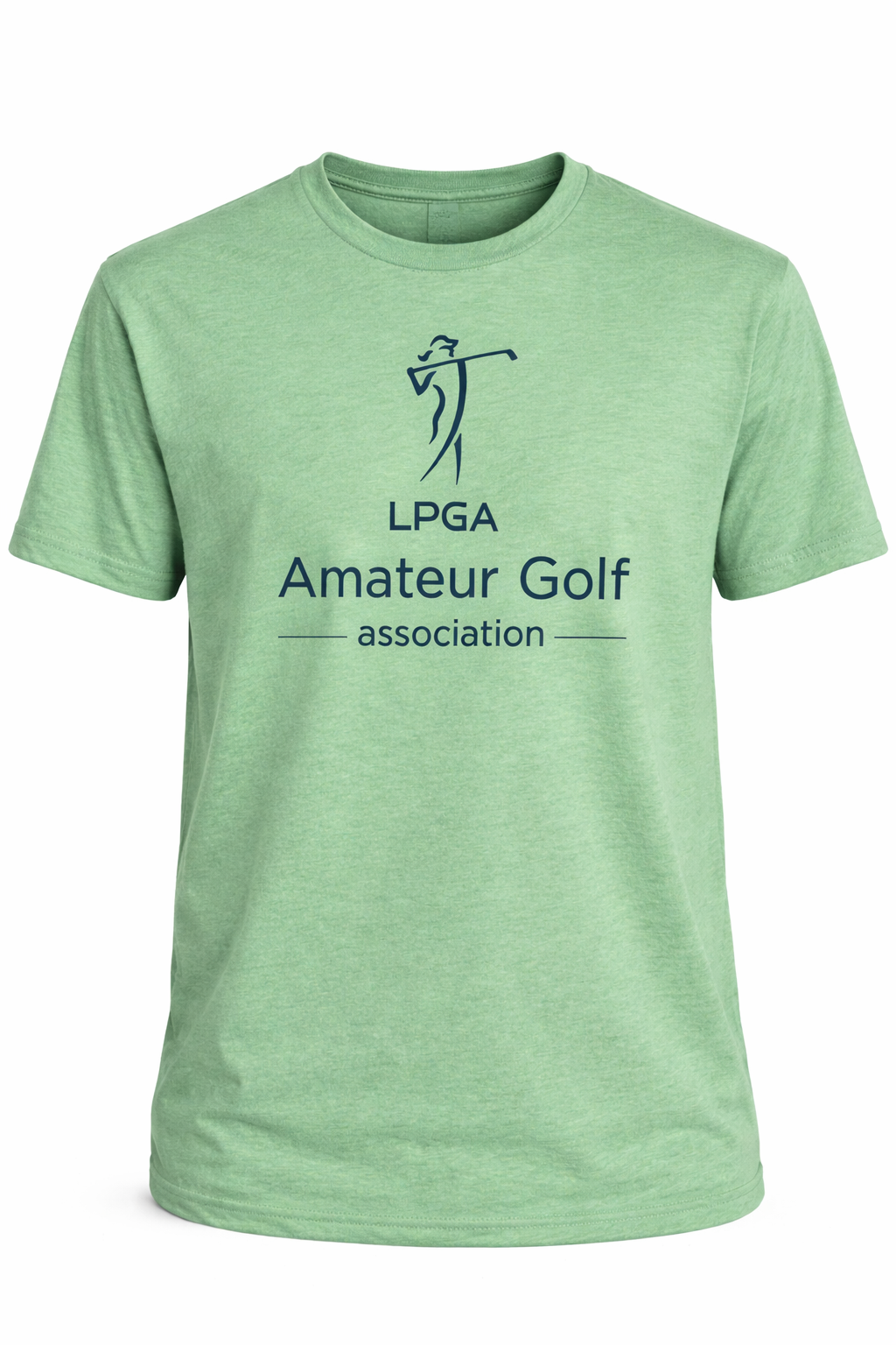 Super soft, comfortable tee. Unisex fit. Standard size. Does not shrink. I was in cold water and hang dry. Great apple green color with navy screenprint LPGA Amateur Logo.