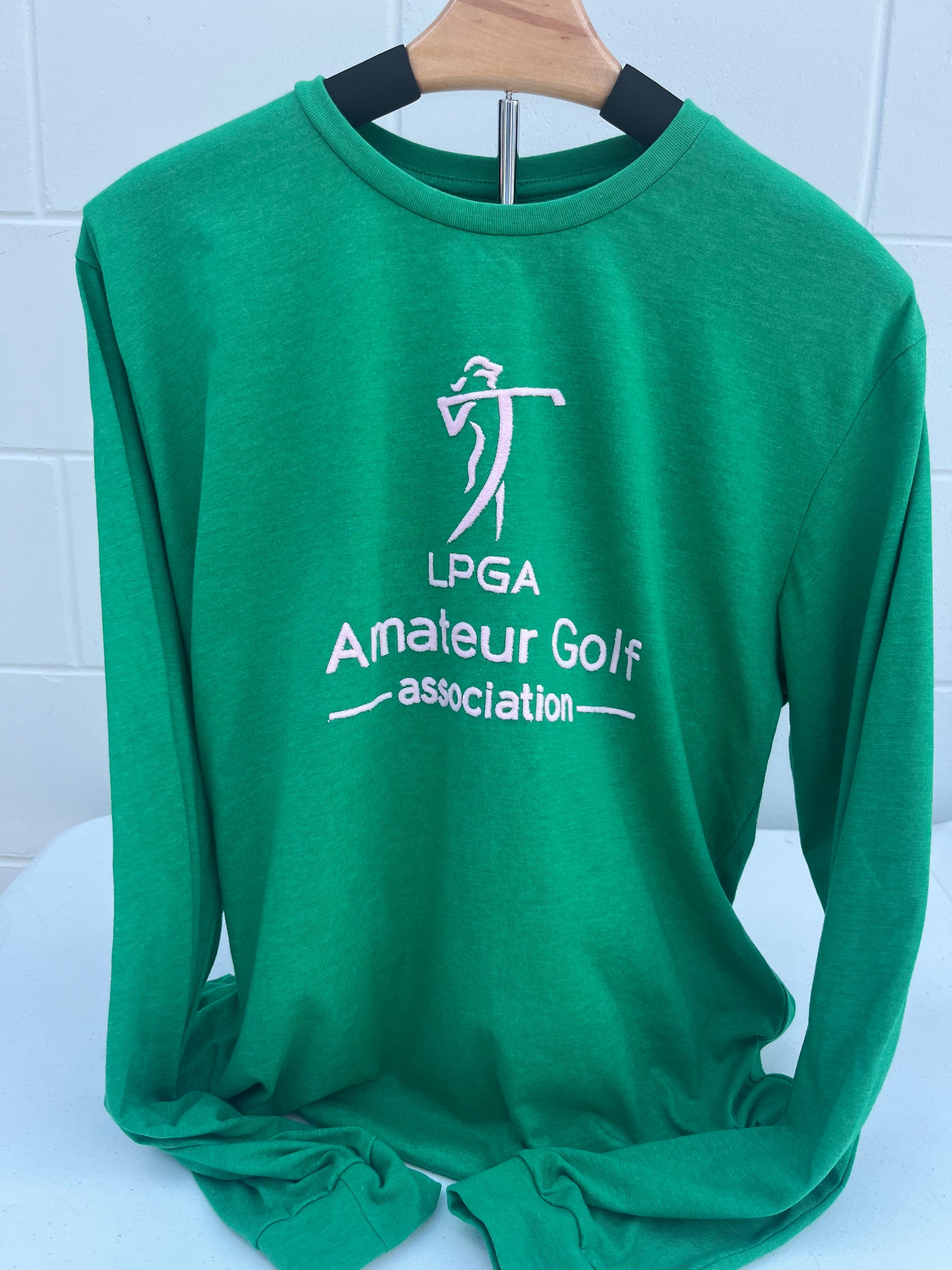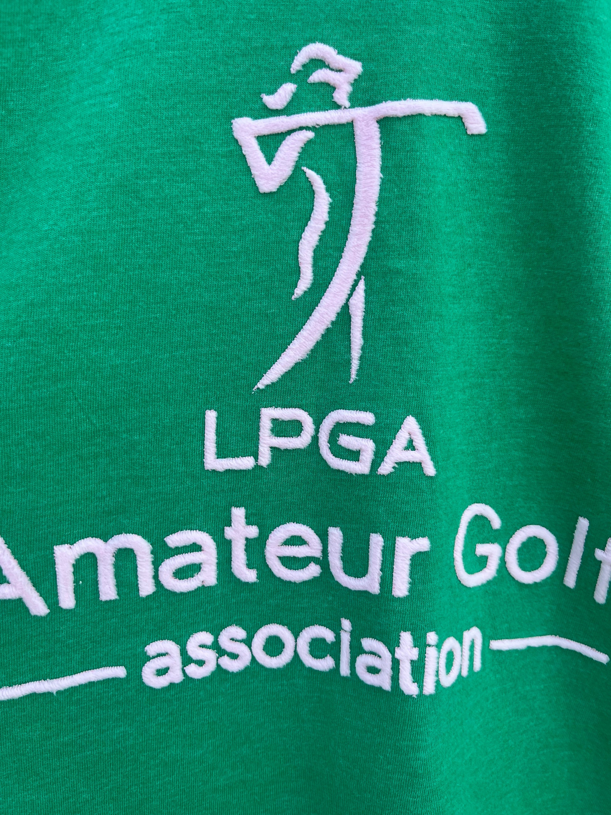 Short Sleeve. UNISEX fit. Soft Blended Cotton Tee. 60/40 Combed ring spun cotton/Polyester. Very soft and comfortable. Washes great. I wash in cold water and hang to dry. Softest Tee shirt you will own! LPGA Amateur Logo in pink flock that gives a 3D appearance like embroidery and fuzzy feel.