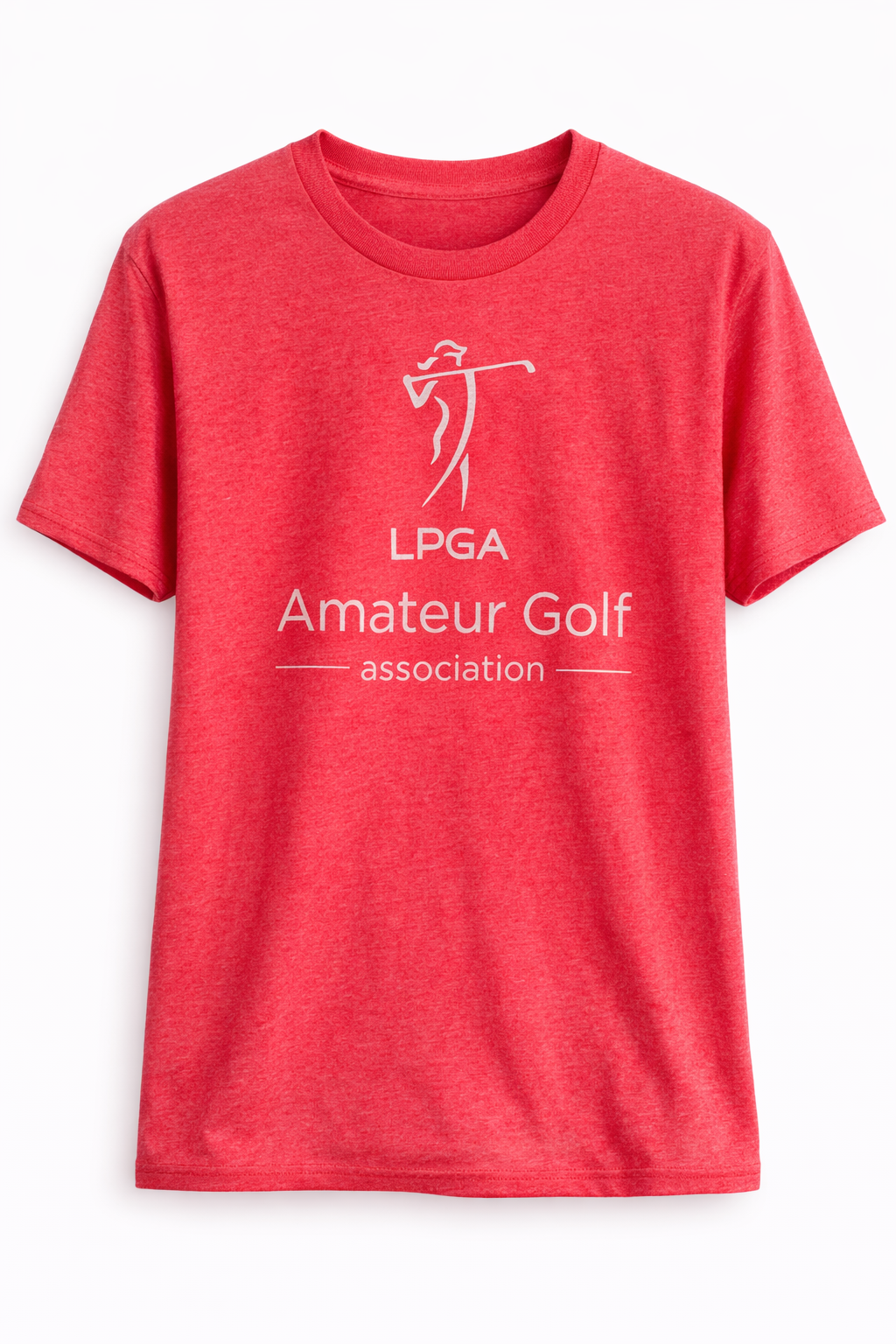 Unisex Fit. Short Sleeve. Tri Blend 50/25/25 Polyester/combed ring-spun cotton/rayon. Very Soft and comfortable. Washes great. I wash in cold and hang to dry. Does not shrink. Softest Tee you'll own! Vintage Red with LPGA Amateur logo in metallic silver screenprint.