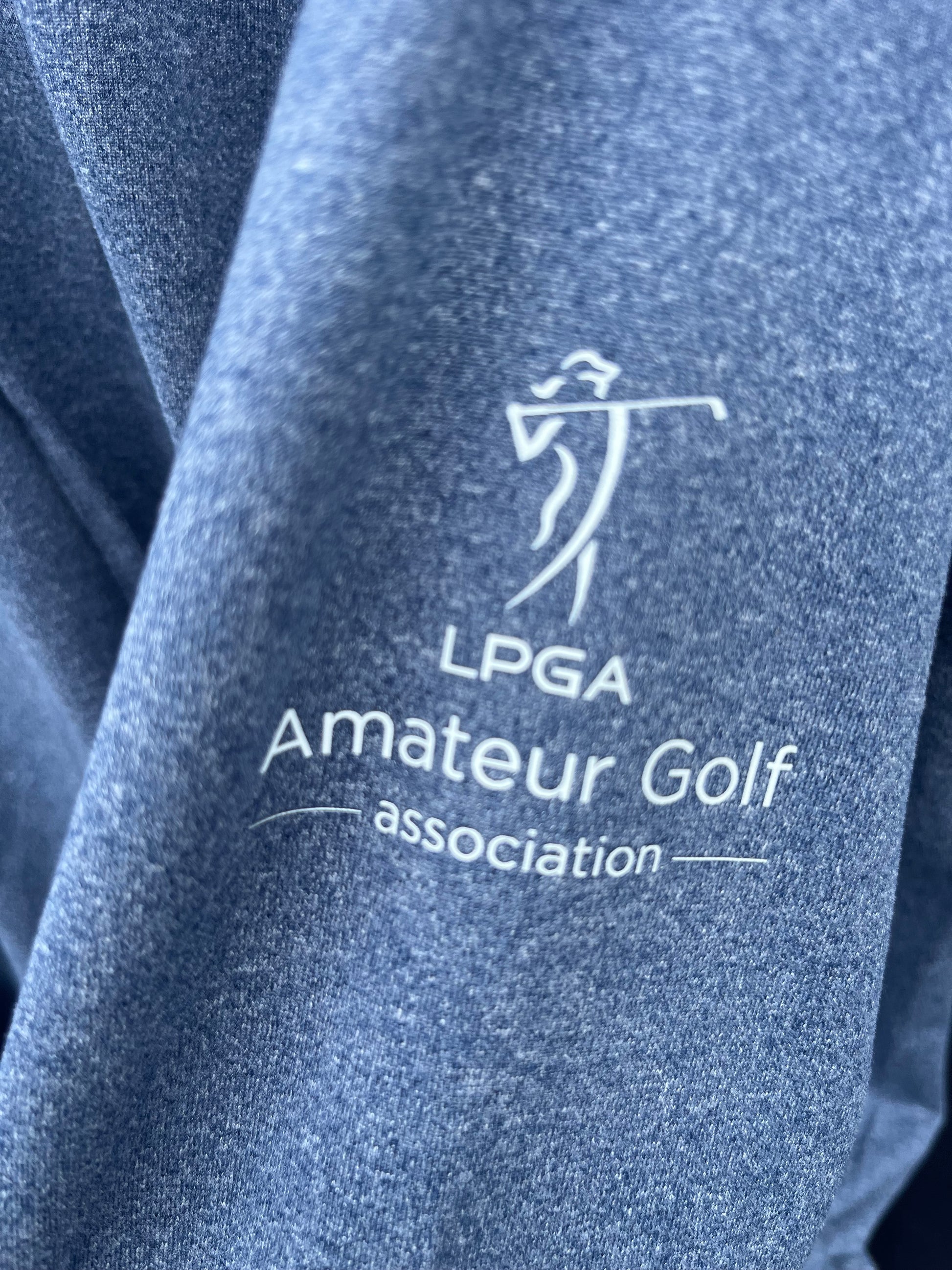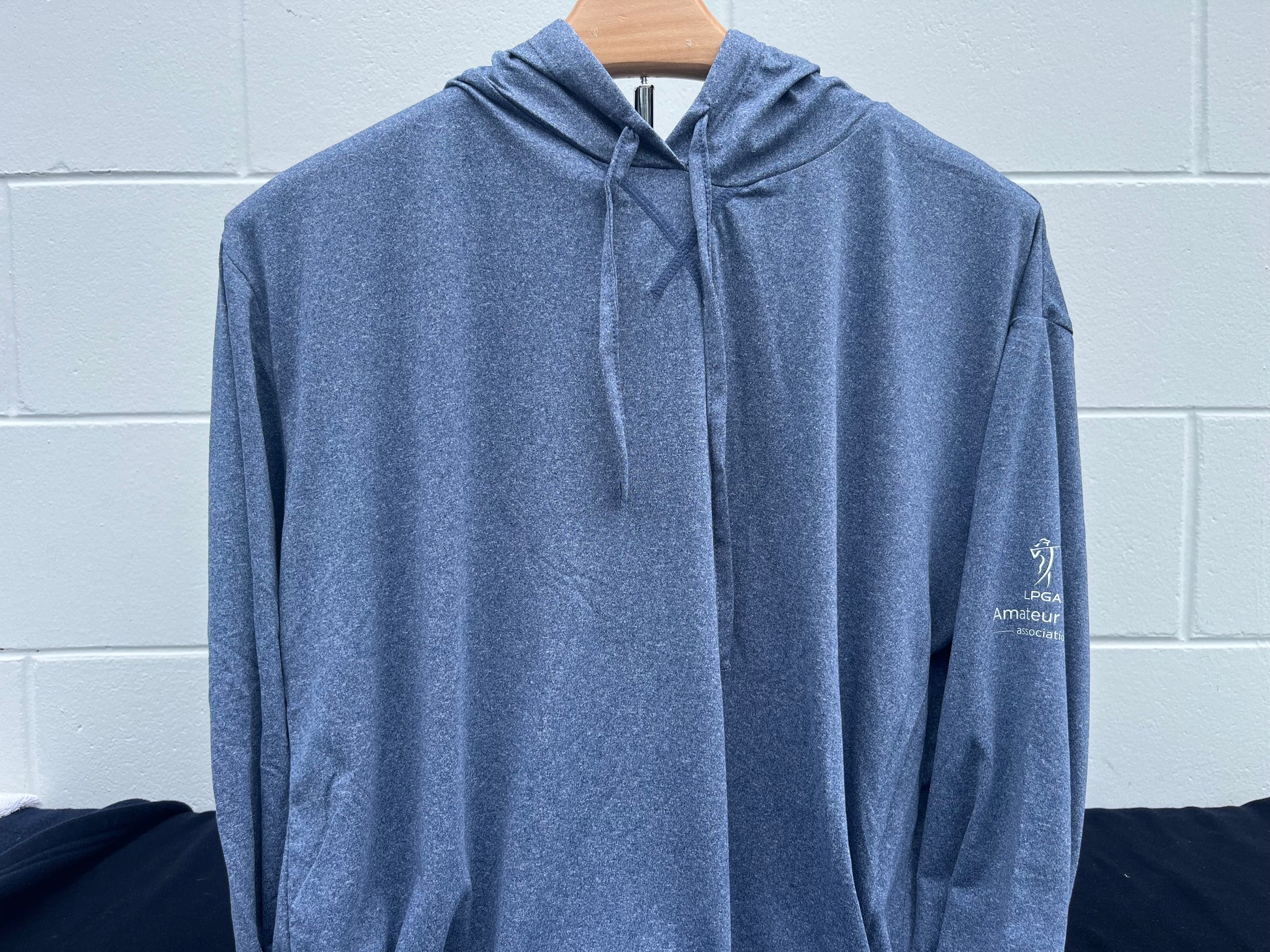 This is a perfect summer hoodie TEE SHIRT. Light, 4-way stretch, regular women's fit. Moisture wicking, quick dry and perfect for those chilly mornings or protection from the sun. 90% polyester and 10% spandex. Navy Heather hoodie with LPGA AM logo in white on hood and full LPGA logo on sleeve. Fit is Women's but a on the bigger side. I wear a XL in this product. (I'm a XL in unisex Tee shirt) Great women's length and fit.